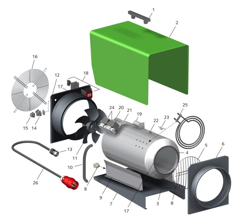 Električni grelec ELT 18-S je bil posebej razvit za možnost dodatne priključitve cevi (transportnega podaljška) za vroč zrak. Topel zrak lahko enostavno usmerite tja, kjer je potreben. Ta rešitev je primerna za ogrevanje ali sušenje jaškov, več prostorov istočasno, težko dostopnih prostorov in lokacij. Dolžina cevi je lahko do 15 m. S posebnim adapterjem lahko priključite dve cevi za vroč zrak.